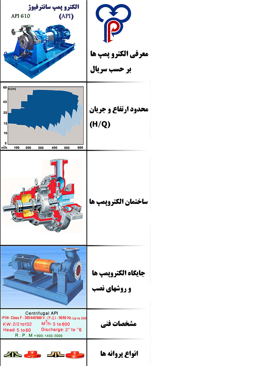 از پمپ هاي گريز از مركز طراحي شده بر مبناي API 610  ويرايش هشتم در پالايشگاه نفت و ساير صنايع پتروشيمي و سرويس هاي نفتي گازي براي كار سنگين استفاده مي شود و قدرت 2/2 تا 132 كيلووات و دبي 50 تا 600 مترمكعب در ساعت (m3/h) را دارا هستند.